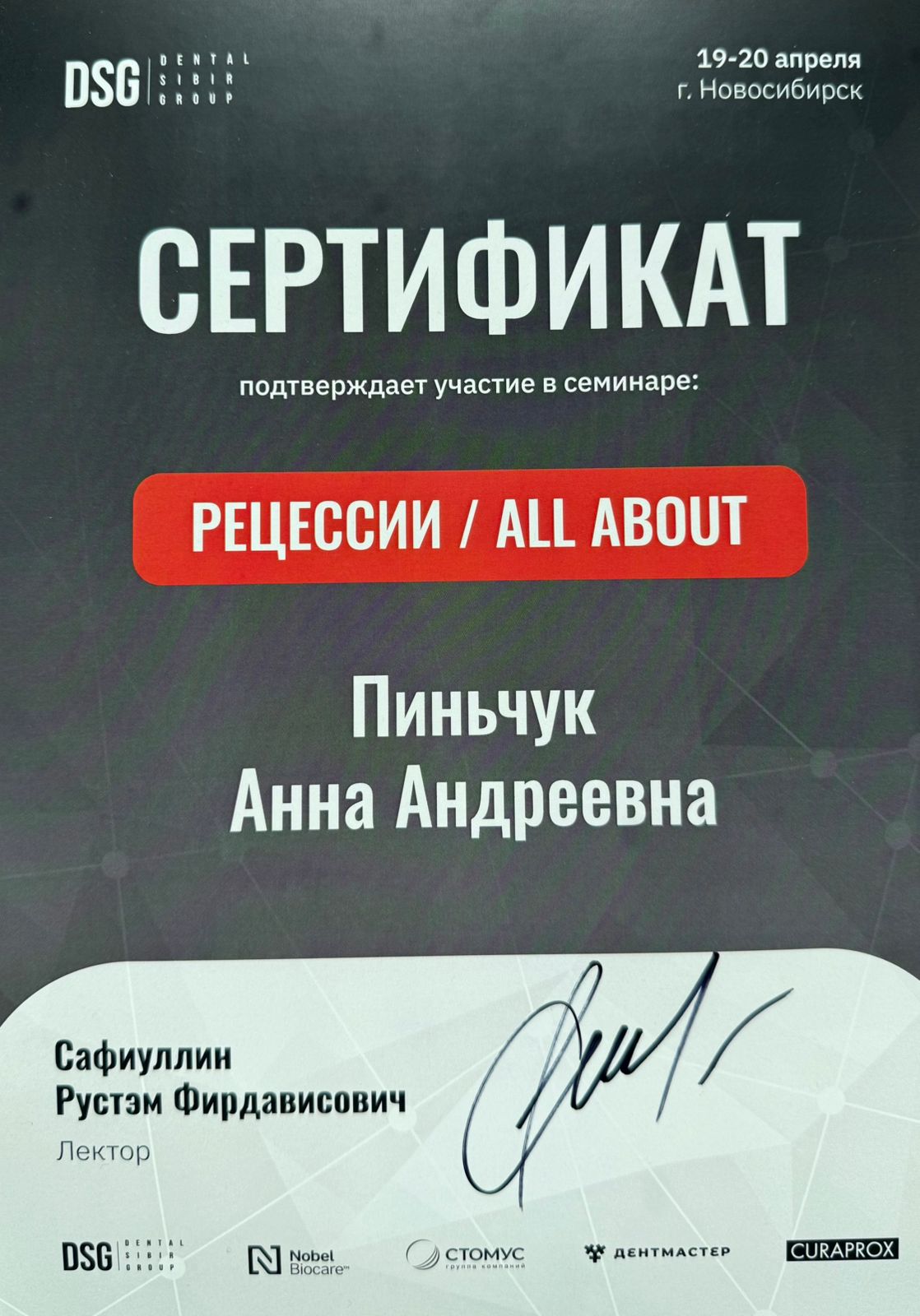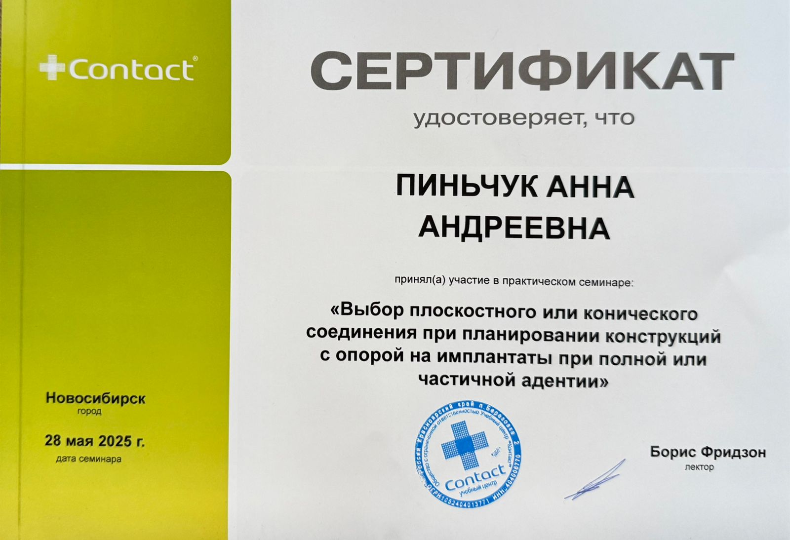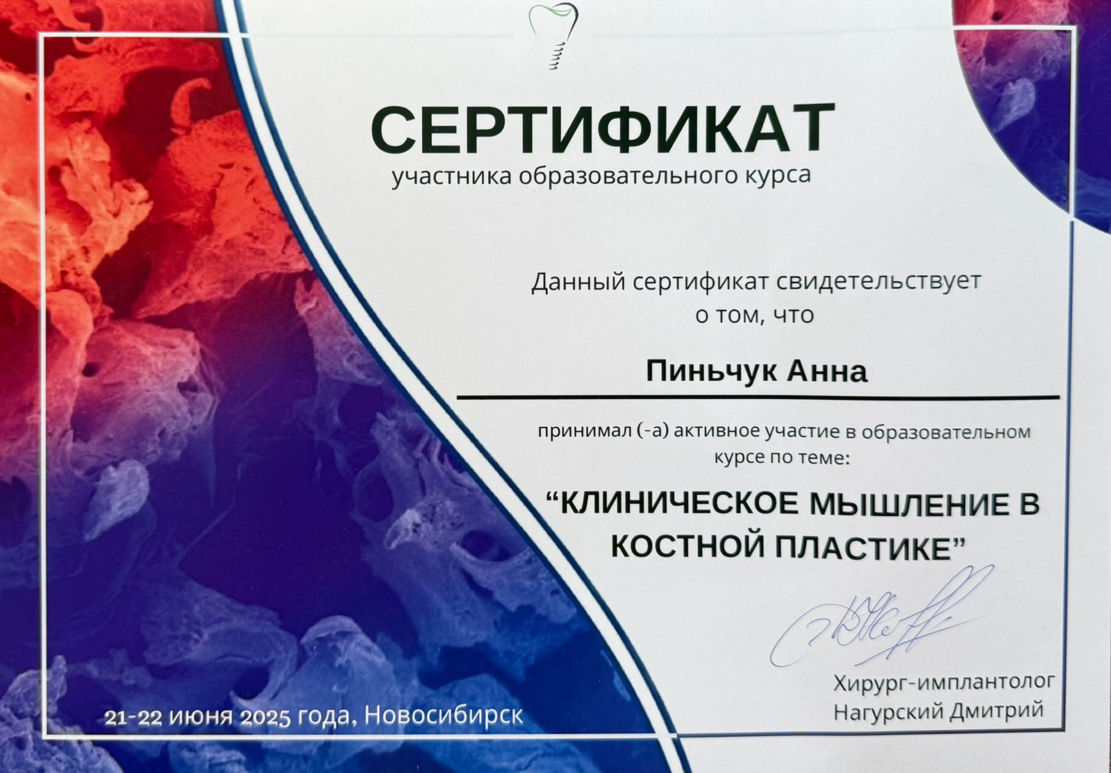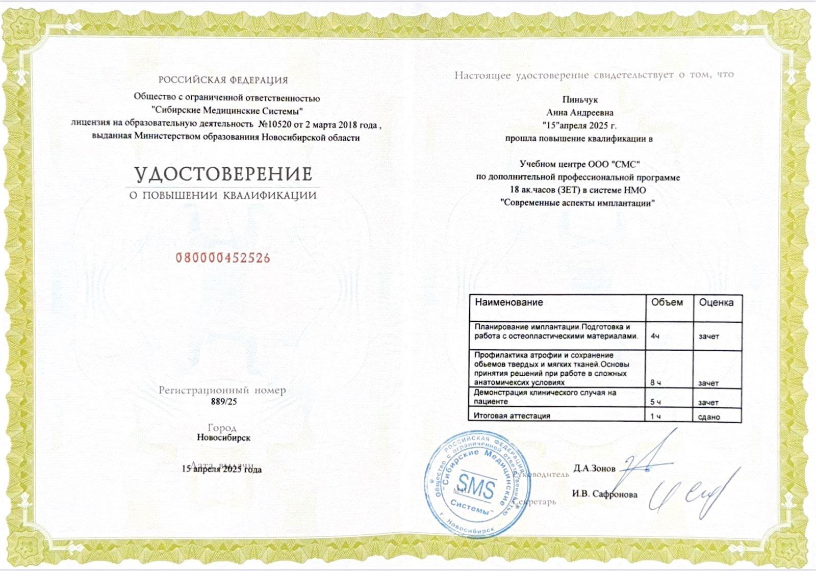 2025 повышение квалификации в Учебном центре ООО «СМС» по дополнительной профессиональной программе «Современные аспекты имплантации»